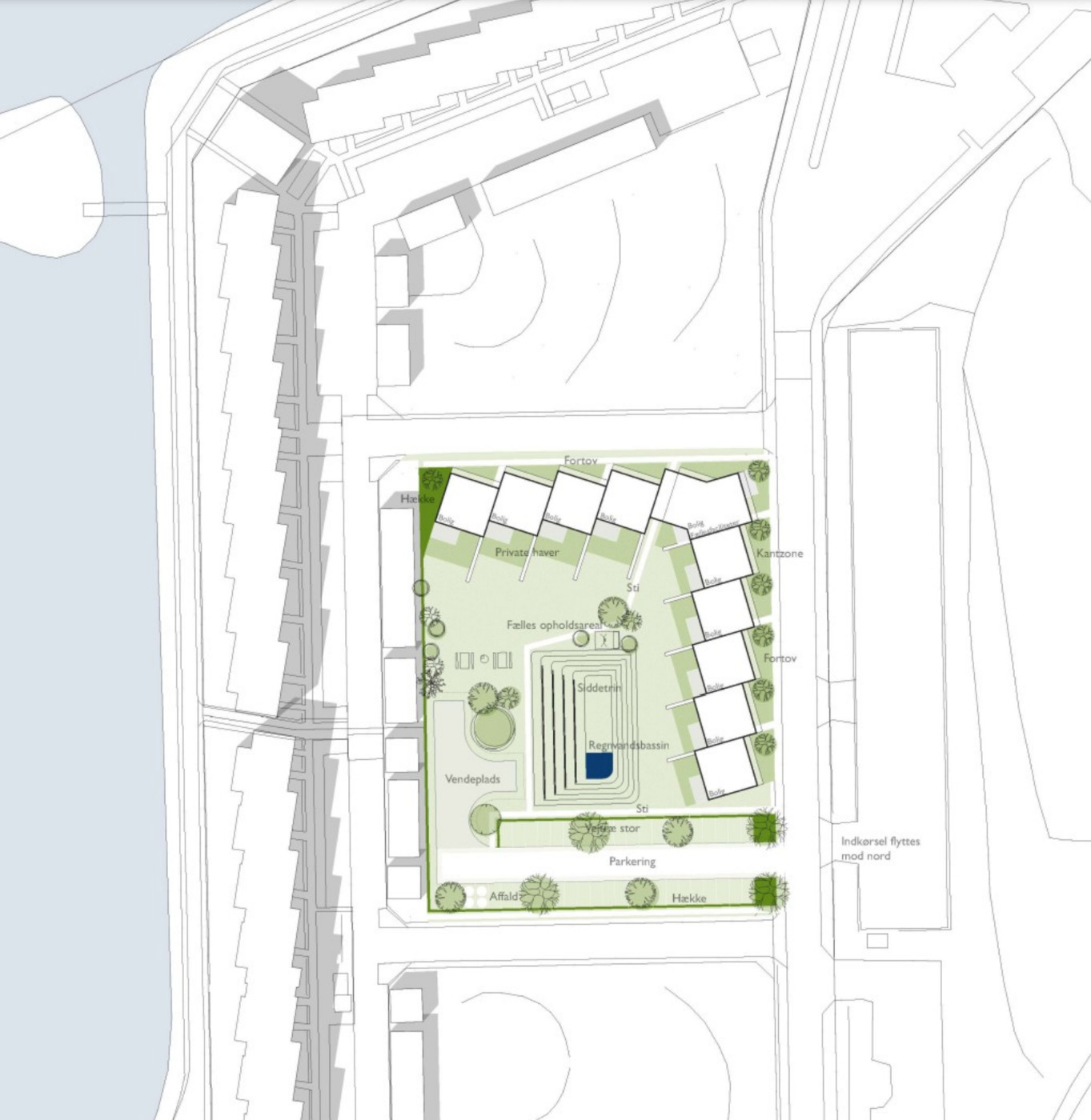 I lokalplanforslaget er ny bebyggelse udformet som en vinkel med længer langs områdets nordlige samt østlige afgrænsning. Tanken er ifølge lokalplanforslaget, at bebyggelsen derved definerer et indre, fælles og grønt friareal. I tilknytning til friarealet etableres et regnvandsbassin.