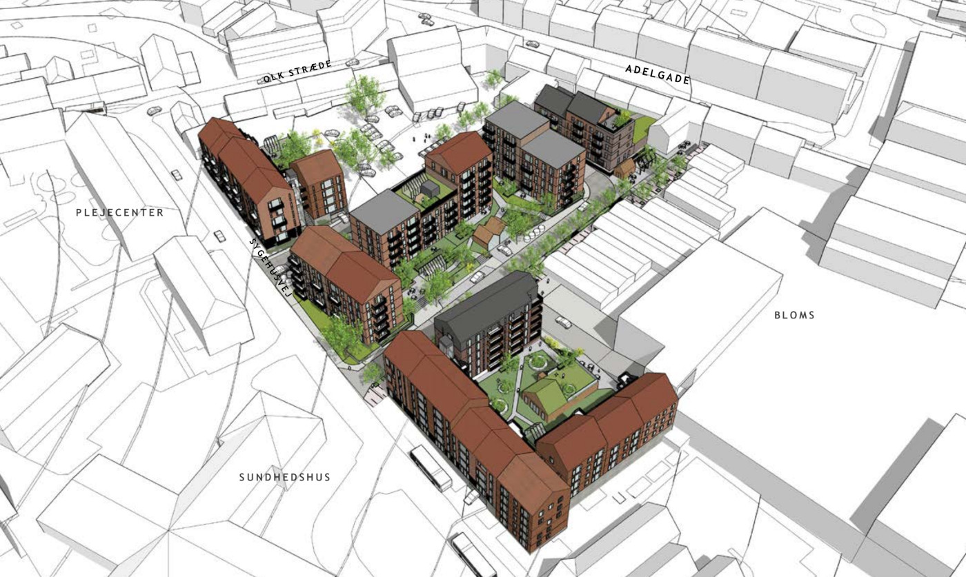 Mellem bygningerne bliver der plads til både udemiljøer til de nye boliger og grønne passager gennem området, så det nye boligområde skaber byrum mellem Sundhedscenteret, Adelgade og Bloms Butikker.